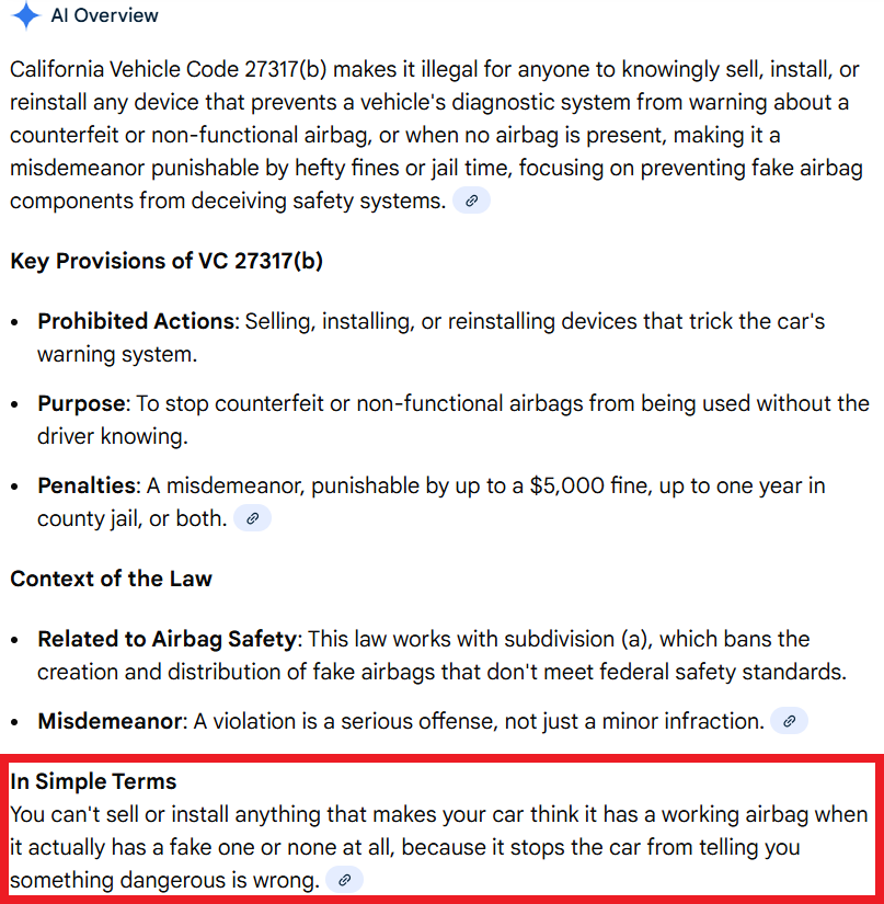 The above costs do not include tax nor installation. Yes, in 2008, it cost over three thousand American dollars to replace the airbag system; that was more than what many of these cars were worth then. Now, only the clock spring is available new and can only be sourced from Volkswagen Classic Parts in Germany at nearly $1000 if you include shipping and import tax. Repairing/replacing the airbag system in these cars is now essentially cost-prohibitive. Furthermore, the airbag system is now long past its 10-year lifespan. The components that deploy the airbag degrade over time, eventually rendering the airbag useless as a safety device. Even if the system fault codes are pulled, the system is repaired and reset, there is no guarantee that the airbag will deploy in a front-end accident. Additionally, the system can be reset one day only to have the lights come back on a few days later (this is indicative of a faulty system that needs replacing, not repairing). On the flip side, there is a small possibility of the airbag deploying on its own, at any given time.